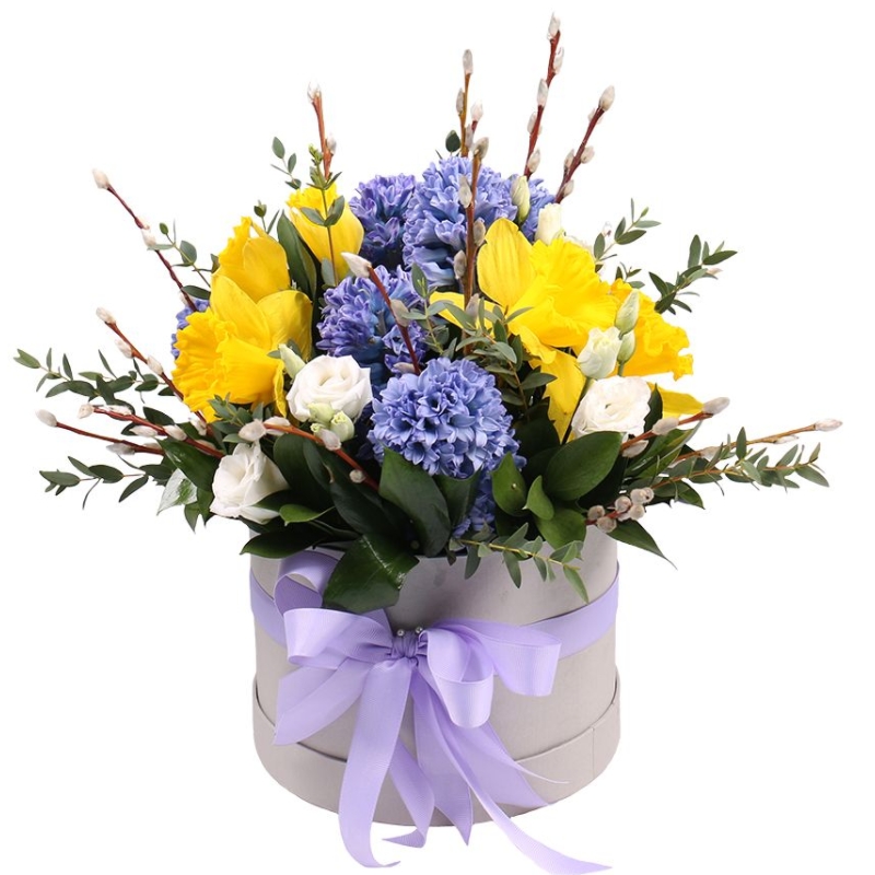 Букет состоит из 7 гиацинтов, 3 ветки эустомы, 5 нарциссов, верба, зелень, коробка, оазис, атласная лента.