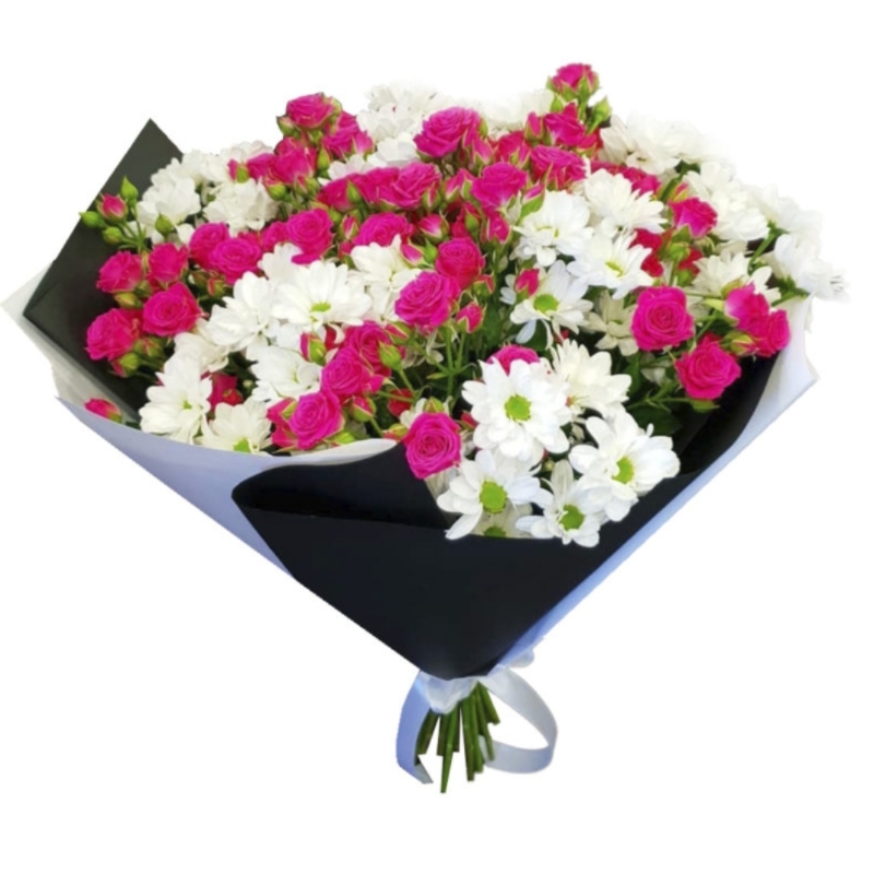 Букет состоит из 11 кустовых роз, 6 веток хризантем, красивая упаковка, атласная лента.