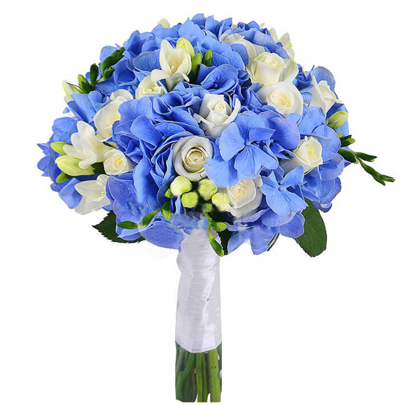 Букет состоит из 1 голубая гортензия, 11 белых роз, 5 веток эустомы, прозрачная упаковка, атласная лента.