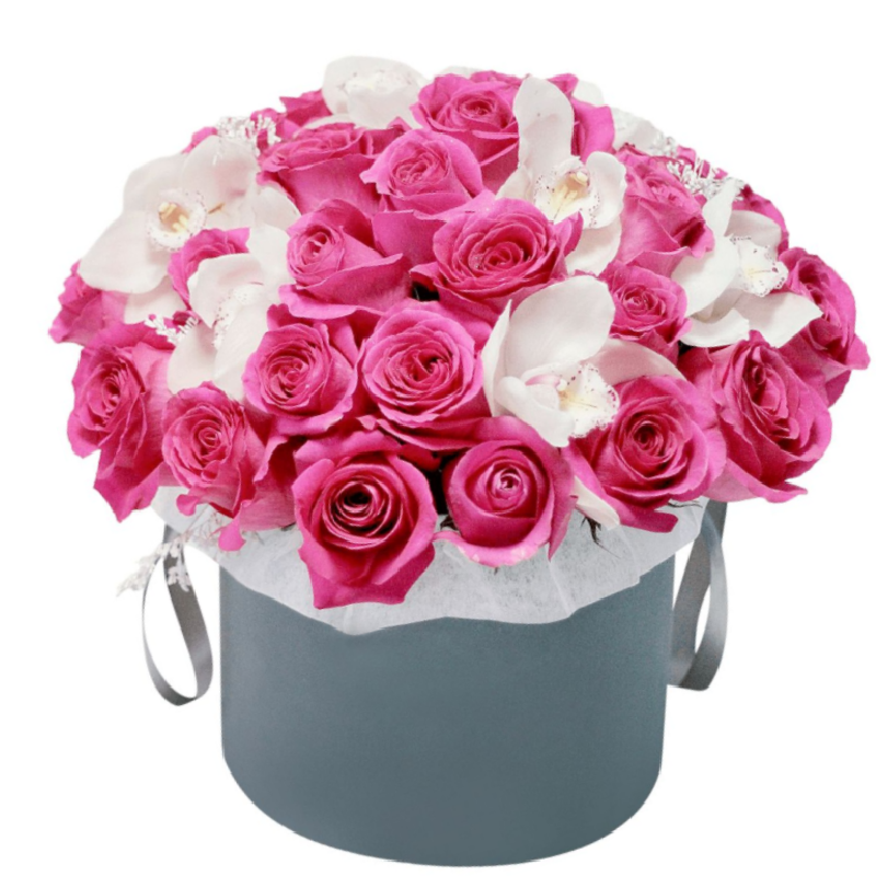 Букет состоит из 31 роза, 10 орхидей, коробка, оазис.